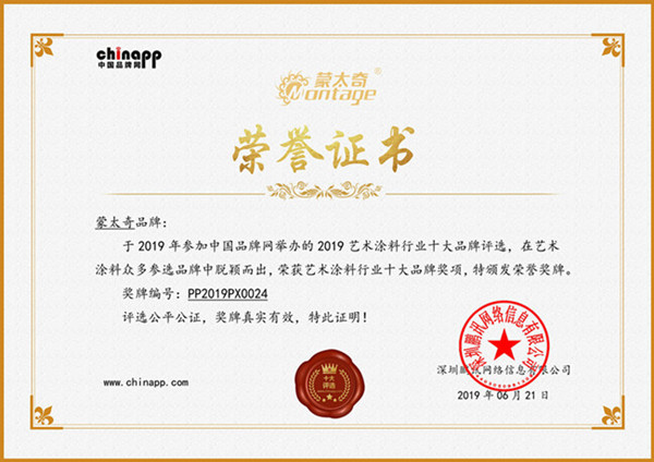 序:蒙太奇品牌于2019年參加中國品牌網舉辦的2019藝術涂料行業十大品牌評選,在藝術涂料眾多參選品牌中脫穎而出,榮獲藝術涂料行業十大品牌獎項。