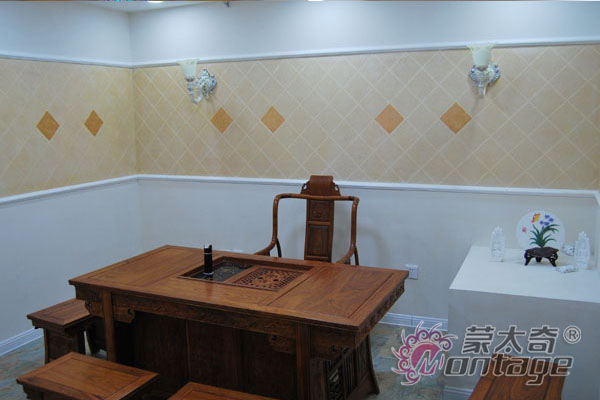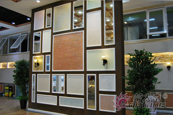 展廳內設有多處個性化的樣板展示區,來合理的成列出蒙太奇品牌各個系列的產品,如:綠色時尚的硅藻泥,高貴、大氣的手工壁紙,精致細膩的白炭黑,平整如水的藝術地坪等。